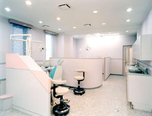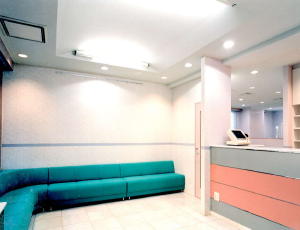 外観はラスタータイルのピインクとし、アクセントに薄いブルーのラインを打継部分に入れ全体を引き締めた。患者導入はエントランス部分を少々中に入れ込んで溜まりの部分を設けてゆったり感を演出した。待合室に入ると、白い大理石の床にグリーンのソファーとオレンジ色の受付けカウンターがまず目に付く、壁は薄いピンクのトリムとたクロス貼りで腰の部分に帯を入れ豪華さを演出し、天井も中央部をアーチ型とし直線的な部屋に”柔らかさ”を出した。