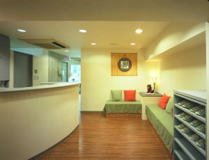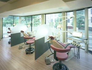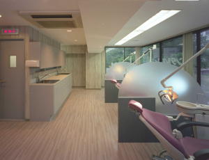 診療室は対称的に壁をコンクリート打放し風のビニルクロス貼りと床を寄木調のビニルシート貼りとして全く違ったイメージを創り出している。ユニット間のスクリーンパネルも木目の濃いグレーの染色と半透明のアクリル板を使用することで重厚感と軽快感を同時に出し、照明も白熱色のダウンライトを加えることで温かみを演出している。