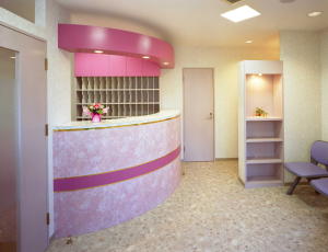 受付カウンターをピンクの濃淡で医院のイメージカラーを創出。玄関のスリッパ棚は殺菌灯付とし衛生面を考慮。診療室は木質系の落着いた雰囲気を演出するため壁にしっくい調のビニルクロス、腰にナラ材を貼り床材に合せ染色、床材は強度(耐磨耗性・耐薬品性)を考慮し同様の質感のある木目のビニルシートを貼った。診療キャビネットと裏方である消毒コーナーを体面とし、また殺菌灯付の収納棚も両面より使用可能とすることで動線の短縮を図った。